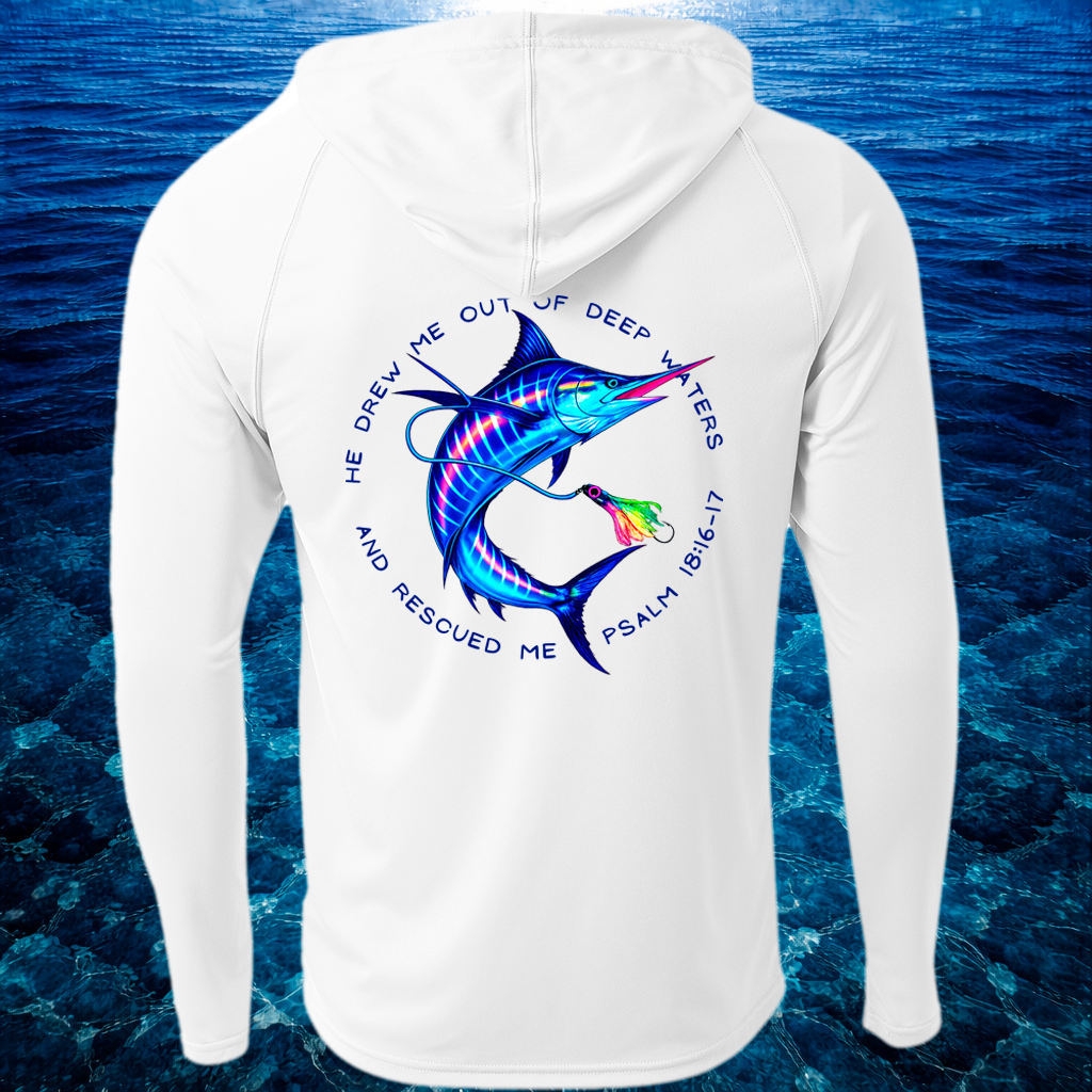 (P08) Seek Truth Psalm 18:16-17 Marlin Christian Men's Cooling Performance Long-Sleeve Hooded T-shirt